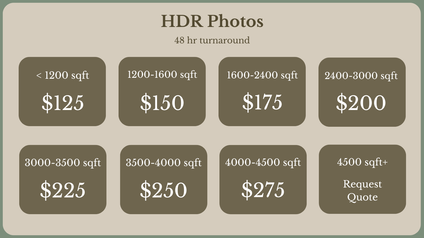 All Real Estate services have a turnaround of 48 hours or less. Photos are delivered via a high-resolution digital gallery. HDR photos include the interior and exterior of the home.